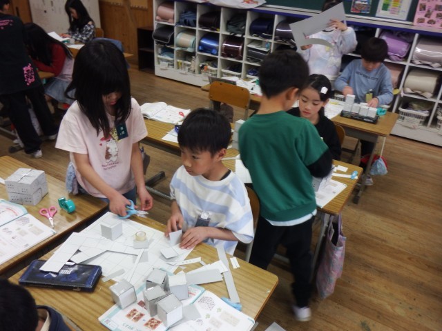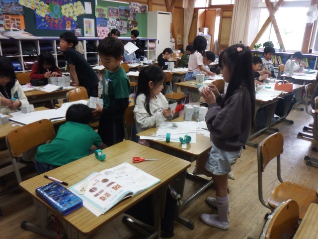 2年生 算数「学びをいかそう やってみよう」教科書の章末問題に取り組みました。やってみよう!の挑戦中!大きなサイコロができました。