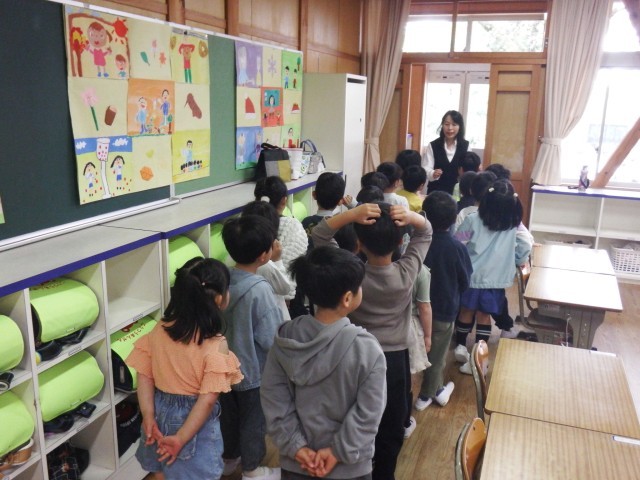 1年生 3時間目の避難訓練に向けて確認をしています。しっかり避難ができるように先生のお話を真剣に聞くことができました。