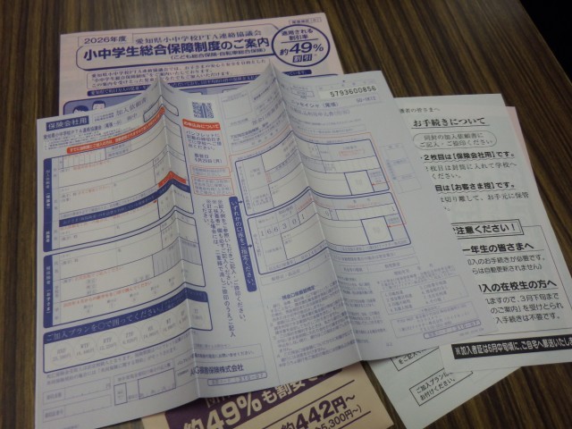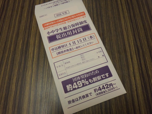 小中学生総合保障制度(ピンクの封筒)の申し込み締切が4月15日(水)となっています。申し込み希望の保護者の方は、学級担任までご提出をお願いします。(愛知県小中学校PTA連絡協議会)
