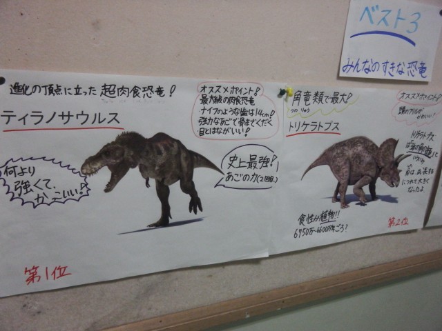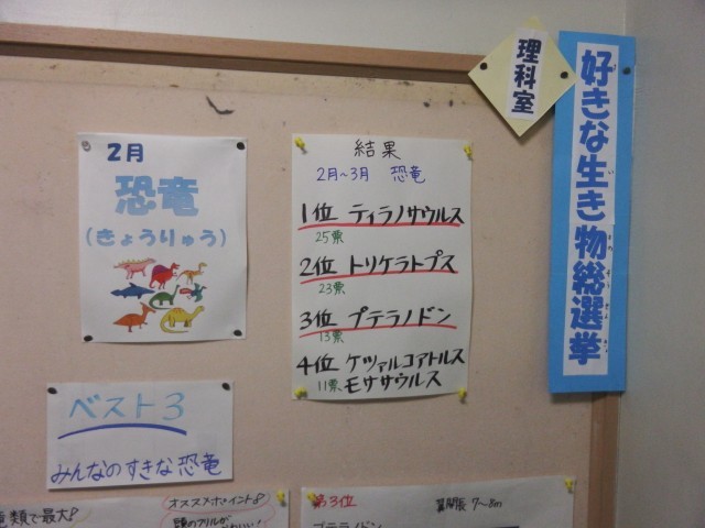 理科 2月の「好きな生き物総選挙」の結果が理科室前に掲示されています。2月「好きな恐竜」編 1位:ティラノサウルス 2位:トリケラトプス 3位:プテラノドン でした。次の投票も楽しみにしていてくださいね♪