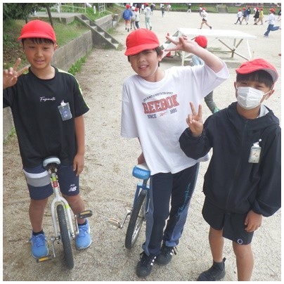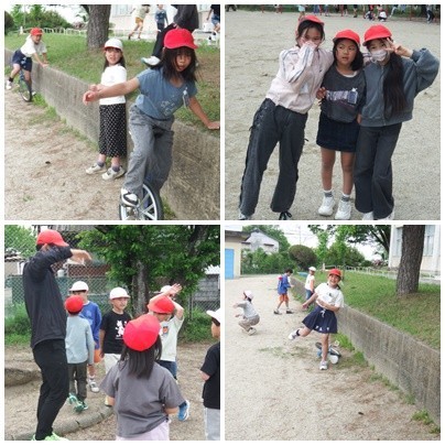 「なかよしタイム」今日のみんなは運動場へ一直線!一輪車の練習に励む子、友達と駆け回る子。チャイムが鳴るまで、元気いっぱいの笑顔が溢れていました。