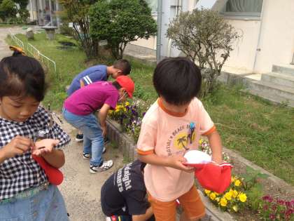 花壇に咲いているビオラの花に、ツマグロヒョウモンの幼虫を見つけた!と子どもたちが騒いでいました。