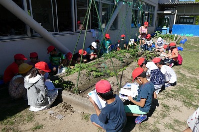 理科の時間に、先日畑に植え替えたツルレイシを観察しに行きました。