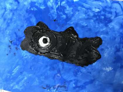 粘土と絵の具を混ぜて,ふわふわとろとろの不思議な手触りの絵の具で作品を作りました。手を絵の具だらけにしながらきれいな景色や動物を描くことができました。