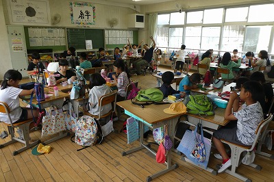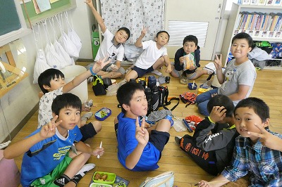 あいにくの天気でモンキーワークの後に行く予定だった犬山浄水場見学が中止になり、学校に戻ってお弁当を食べることになりました。クラスごとにお弁当のスタイルは様々で、床で皆で食べるクラスもあれば、いつも通り給食のグループで食べるクラスもありました。どのクラスの子も「教室でお弁当を食べる」という滅多にできない経験を楽しんでいました。写真は1・2組です。
