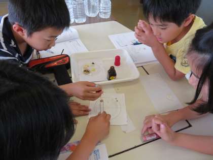 初めて使うヨウ素液に子供たちは興味津々。