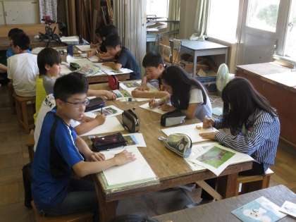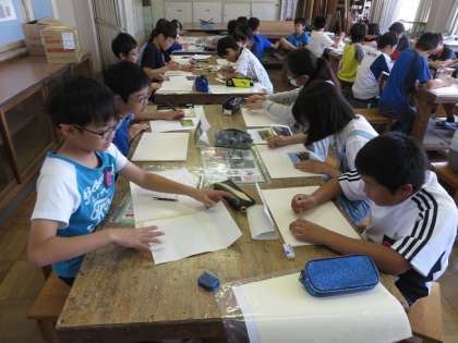 図画工作で版画の制作が始まりました。テーマは「修学旅行の思い出」です。それぞれ修学旅行で強く印象に残った場面について考え,鉛筆を使用して下書きをしました。修学旅行の思い出を語り合いながら,楽しく取り組むことができました。