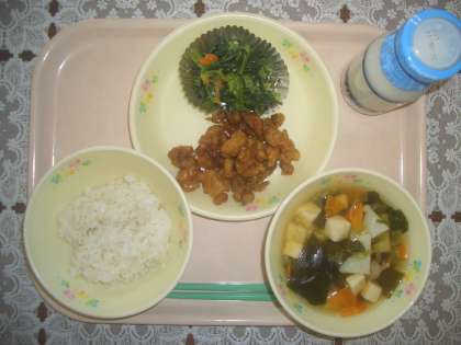 「鶏肉と大豆の甘がらめ」は、それぞれを唐揚げにして甘辛いたれにからめてあります。子どもたちが大好きな鶏肉の唐揚げを大豆といっしょに食べることができ、栄養価も高い料理です。