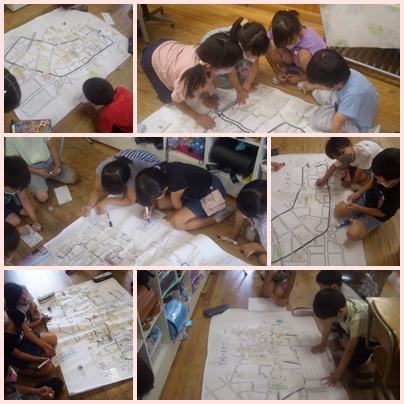 2年生は、白地図を囲んで何やら相談中です。先日の町探検で見つけたものカードの書いて白地図に貼り付けています。みんなで協力して完成させます。
