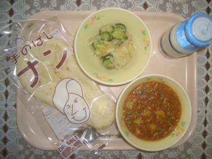 今日は、子どもたちの大好きなカレーです。ナンと一緒にいただきます。今日の授業参観は中止になりましたが、どの子も元気に授業を受けていました。午後からは引き取り訓練です。ご協力お願いします。