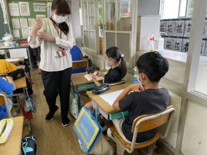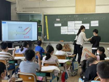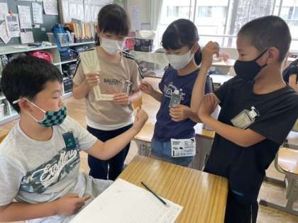 人の体と運動について学習しています。物を持った時の自分の腕の様子を見たり触ったりして調べました。