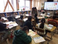 1年生の教室から、デイビット先生の大きな声と子どもたちの明るい笑い声が聞こえてきました。今日の英語の授業では、クリスマスの飾りを作りながら、楽しく英語に親しむことができました。