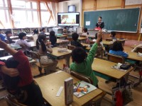 1年生 国語「おむすびころりん」おむすび ころりん すっとんとん。ころころ ころりん すっとんとん。どんな内容かな?ゆっくり丁寧に読み進めています。