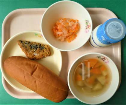サンドロールパン 牛乳 サバの竜田揚げ たまねぎマリネ
