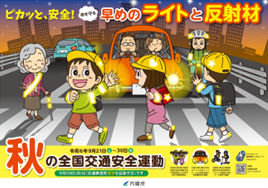 秋は、日の入り時間が急激に早まり、運転者から歩行者や自転車の動きが見えづらくなる夕暮れ時と、仕事や学校からの帰宅時間帯とが重なるため、歩行者や自転車利用者が被害に遭う交通事故の危険性が高まります。