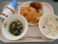 【献立】 牛乳 ご飯 春巻 厚揚げの中華うま煮 中華風コーンスープ