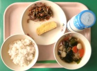【献立】 ご飯 牛乳 厚焼き卵 くきわかめのきんぴら しらすつみれ汁