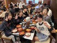 朝食を大広間で全員で食べました。食事後は協力して片付けも頑張りました。
