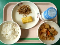 【献立】  ご飯 牛乳 豚肉と大根の煮物 厚焼き卵焼き 豆じゃこふりかけ