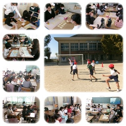 1.2年生は道徳です。食事で使う箸、あいさつ、じゃんけんなど、日本と世界の違いにふれ、それぞれのよさを感じ取っています。3.4年生は理科です。春や夏に育った植物が、秋にどうなっているのかを観察しています。藤の花の実に種があるのを見つけましたね。6年生は音楽です。曲を聴いて、伴奏や旋律の繰り返しなどの変化に気がついたところを話し合って交流しています。