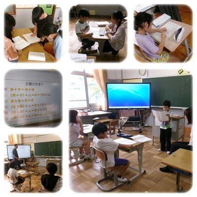 1.2年生は国語です。漢字の学習です。1年生は漢字を使った数え歌を作って発表しています。3.4年生は算数です。3年生は長さやかさ、重さなどの単位の学習、4年生は計算のきまりの学習です。難しい問題にも挑戦しています。6年生は国語です。物語文を読んで、登場人物の心情の変化を読み取っています。