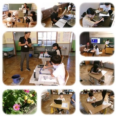 1.2年生は情報の学習です。運動会の招待状を作成しています。3.4年生は理科です。月の形が変化するのはなぜか、皆で話し合いながら、学習しています。6年生は書写で、毛筆に取り組んでいます。それぞれの文字の大きさに気をつけて、「思いやり」の字を書いています。