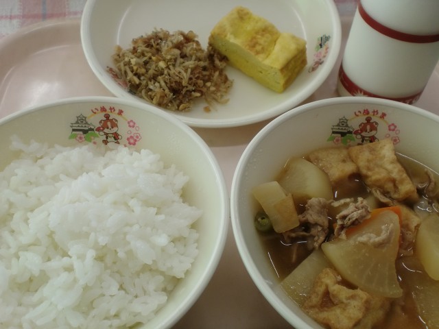 献立: 豚肉と大根の煮物 厚焼き卵焼き 豆じゃこふりかけ