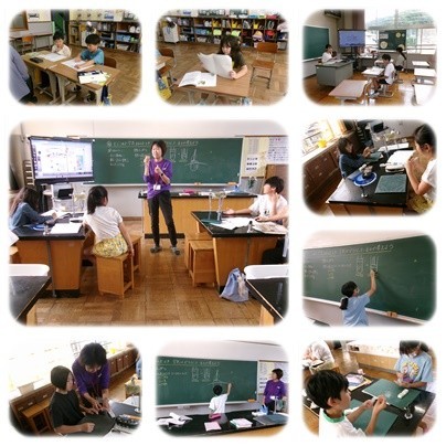 1.2年生は国語です。物語文を読んで、登場人物の思いを想像しています。3.4年生は理科です。閉じ込めた空気の性質について調べています。注射器に閉じ込めた空気をおしたとき、ピストンはどうなるか、予想を立てて実験をしています。6年生は音楽です。子守歌を聴いて、普段聴いている曲との違いや、曲の良さを話し合っています。