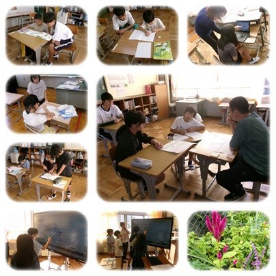 1年生は国語です。漢字の学習をしています。2年生は算数です。2の段のかけ算の学習です。学習用情報端末で繰り返し、自分のペースで練習しています。3.4年生も算数です。3年生は円と球の練習問題にチャレンジして、既習内容が身についているか確認しています。4年生は面積の学習です。面積が4㎠となる形を考えて、みんなで交流しています。自分一人では思いもつかなかった形が次々出てきて、面白いですね。6年生は国語の学習です。よりよい学校生活にするために、議題を決めて話し合い、解決していく学習です。篠笛を議題として、さらによりよい篠笛の取組となるよう話し合っています。今日も犬山中学校の2年生が職場体験として来てくれています。ありがとうございます。いろいろな経験をして、充実した1日となることを願っています。