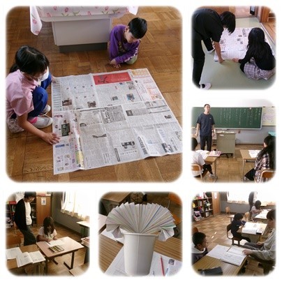 1.2年生は国語です。1年生は、学校にいる生き物や見つけた物を紹介する文を書きます。読んでもらう人によく分かるように書けるといいですね。2年生は教科書に書かれている作り方の説明文を読み取って、紙コップ花火をつくります。花火の色合いを考えています。3.4年生は算数です。4年生は1平方メートルの大きさの新聞紙を使って、教室や理科室、廊下などの大きさを調べています。6年生は国語です。古典を読んで、昔の言葉の響きやリズムを感じ取りました。そして、昔の言葉を使って、オリジナルの文章をつくっています。