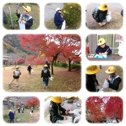 1.2年生が秋の植物を見つけに、桃太郎公園に行きました。春や夏の様子を思い浮かべながら、葉っぱやどんぐりなどを観察しています。