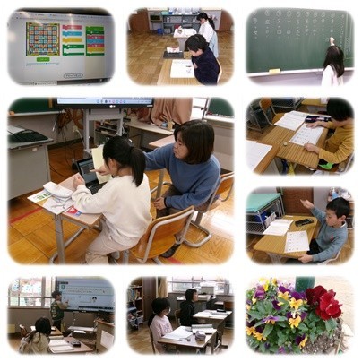 1.2年生は国語です。漢字の学習をしています。字のつくりや形に気をつけて丁寧に書いています。3.4年生は算数です。3年生はプログラミングの学習です。レーシングカーを動かすプログラミングを組み込んでいます。コインや星、タイヤを集めながらゴールを目指します。工夫して自分だけの道順で作っています。4年生は小数の割り算です。小数を整数で割ったり、整数同士の割り算で答えが小数になったりする計算を皆で話し合いながら、問題を解決しています。6年生は国語です。やなせたかしさんの伝記を読み、やなせさんの生き方について考えています。