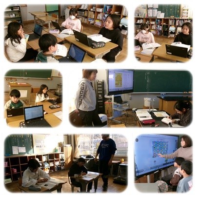 1年生は算数です。プログラミングの学習をしています。電子黒板や端末を見ながら、上や右に進む指示をどのように組み合わせると、思った通りロボットを動かせるか、考えています。3,4年生は国語です。3年生は「三年とうげ」という民話を読んでいます。今日は初めての学習なので、話の内容をつかんでいます。4年生は「友情のかべ新聞」という物語を読んで、それぞれが面白いところを見つけて、みんなで紹介し合っています。6年生は国語です。やなせたかしさんの伝記を読んで、やなせさんの人生に大きく影響を与えた出来事は何かを考えて話し合っています。