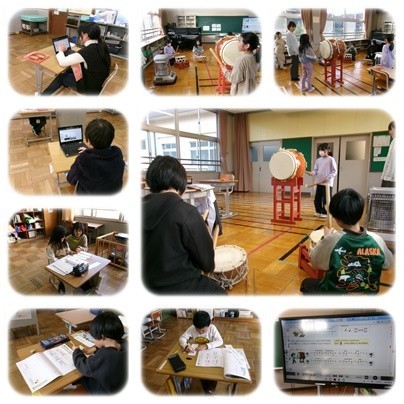 1.2年生は書写の授業です。フェルトペンを使って、書き初めの練習をしています。3.4年生は音楽です。おはやしづくりにチャレンジです。締太鼓や大太鼓を使って、自分たちでリズムを工夫しながら、豪快に叩いています。6年生は理科です。「大地のつくりと変化」の学習で学んだことをスライドにわかりやすくまとめています。一度学習したことを自分なりにまとめ直すと理解がより深まりますね。