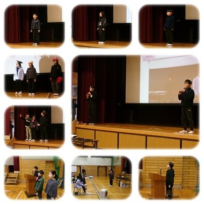 今日は学習発表会でした。前半は、今まで学習してきたことの中から、自分たちが伝えたいと思ったことを学級で、また個人で発表しました。個人発表は、スライドでの国語や理科の発表、カードを使った漢字パズルや算数クイズ、縄跳びの実演、都道府県や伝統工芸品のクイズ、生き物のクイズ、水溶液の性質を生かした実験、静電気の実験やスーパーボール作りなど、どれも個性豊かで、よく工夫された発表でした。後半は篠笛でした。学級や個人で曲を披露し、最後は全員で「大きなもも」や「桃太郎」など4曲を披露しました。どの子どもも大活躍でした。来てくださった保護者や地域の皆様、ありがとうございました。