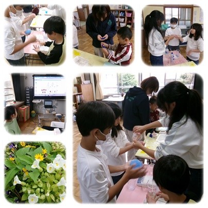 6年生が算数の比の学習で学んだことを生かして、低学年と一緒にスライムを作りました。洗濯のりとホウ砂、水を使って、混ぜる割合を示しながら、一緒に作っています。楽しそうです。4年生は国語です。修飾語の学習をしています。主語と述語だけの文章よりも、「どんな」「どのくらい」のような言葉を使うと、より意味が詳しくなることを学んでいます。
