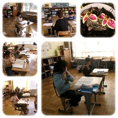1.2年生は国語です。1年生は、学校にいる生き物や見つけた物を紹介する文を書きます。読んでもらう人によく分かるように書けるといいですね。2年生は教科書に書かれている作り方の説明文を読み取って、紙コップ花火をつくります。花火の色合いを考えています。3.4年生は算数です。4年生は1平方メートルの大きさの新聞紙を使って、教室や理科室、廊下などの大きさを調べています。6年生は国語です。古典を読んで、昔の言葉の響きやリズムを感じ取りました。そして、昔の言葉を使って、オリジナルの文章をつくっています。