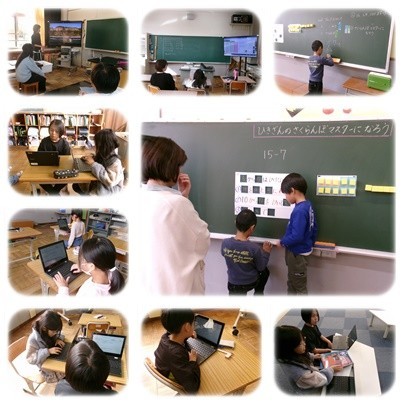 1.2年生は算数です。1年生はくり下がりのある引き算です。図を使いながら友達に分かりやすく説明しています。2年生はかけ算です。6の段の練習をしています。3.4年生は総合的な学習の時間です。木曽川の生態系や環境問題について調べています。学習用情報端末を使って調べたいことを共有し、図書館に移動して解決できそうな本を探しています。6年生は理科です。大地のはたらきの学習が始まりました。動画を見て、地層の様子を見ています。