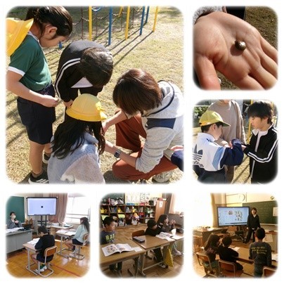 3.4年生は桃太郎公園へ行き、理科の学習で、秋の生き物の観察をしました。ショウリョウバッタとトノサマバッタを見つけ、観察しました。夏と比べて、生き物は少なくなったことに気がつきました。