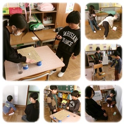 2時間目の放課に1.2年生の主催でおもちゃまつりをしました。今日は4年生を招待して、前半3つ、後半2つのおもちゃで遊んでもらいました。とれた得点に応じて、ひまわりの種をプレゼントしていました。1.2年生は、今日のためにしっかり準備して、あそび方を分かりやすく説明してくれました。とてもよく考えられた手づくりの遊びで、4年生も大満足でした。1.2年生のみなさんありがとうございました!