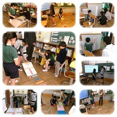 12年生は学習発表会の計画づくり、34年生は段ボールカッターの使用、56年生は算数で面積と体積の計測の学習です。