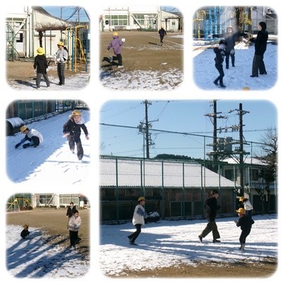 校庭に雪が残っています。みんなで雪合戦です。とても楽しいですね。