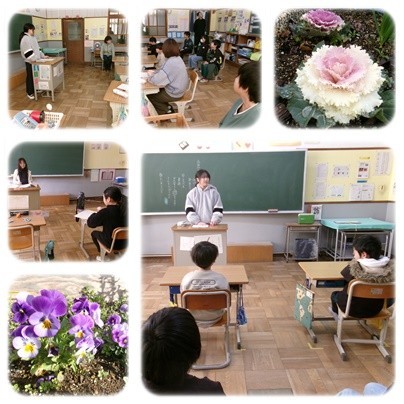 1.2年生は図工です。ゴムの力を利用してとびだすものをつくっています。紙コップや色紙を使って、思いを膨らませながらつくっていますね。3.4年生は理科です。生き物の1年間についての学習です。これまで1年間かけて生き物の様子を観察してきたので、あらためて振り返ってみて気がつくことや分かったことを動画を見ながら確認しています。6年生は道徳です。新幹線の開発を進めた三木忠直さんや、アフガニスタンの人々のために働いた中村哲さんの生き方について、感じたことを話し合い、考えを深めています。