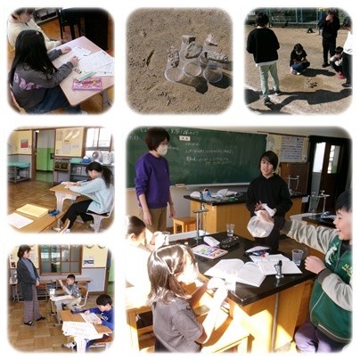 1.2年生は算数です。学習プリントの問題を解いて、1年間の学習を振り返っています。3.4年生は理科です。雨水がたまった後、その水はどうなるか、予想を立てて実験をしています。そのまま地面にしみこむのかな?蒸発するのかな? 6年生は教科全体にわたって、1年間取り組んできたことのまとめをしています。