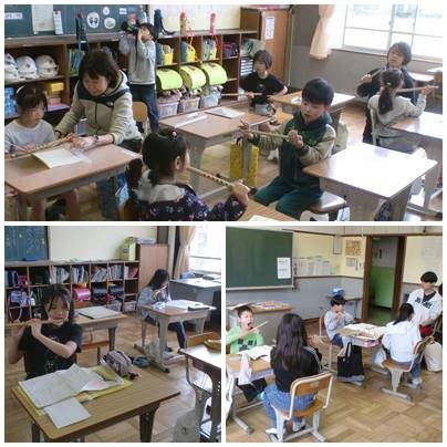 水曜日の朝は篠笛の練習です。上級生が丁寧に教えてくれます。1年生は音を出すのが難しいですね。でも、がんばっています!