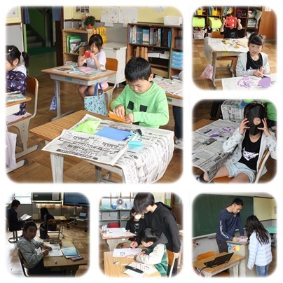 1年生は算数の授業で線を引く練習をしています。2年生は表とグラフの学習をしています。34年生は算数の授業を行っています。5年生は図工で木の絵の具の塗り方を学習しています。同じ技法で描いても、それぞれ個性あふれる木になっています。