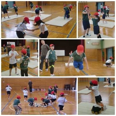 体つくり運動の学習です。マット上で力試しの運動とジャンプの練習、立ち幅跳びをしました。最後は「宝集めゲーム」を楽しみました。