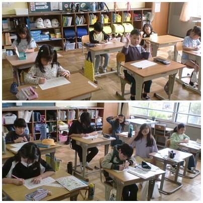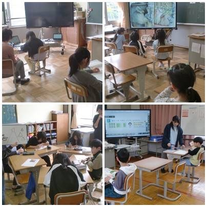 1年生は「あ」のひらがなの書き方を学習しています。2年生は「ふきのとう」を工夫して音読しています。34年生はそれぞれの国語の単元を学習しています。5年生は違う立方体の体積の比較を、それぞれの方法で調べています。