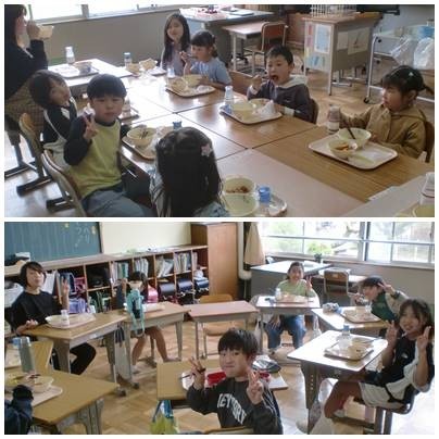 低学年は人数が増え、会話が弾みます。お祝いデザートを楽しみに、もりもり食べましょう。