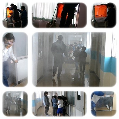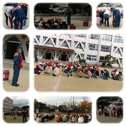 火災時の避難訓練をしました。2年生は煙道体験、5年生は消火器での消火体験、